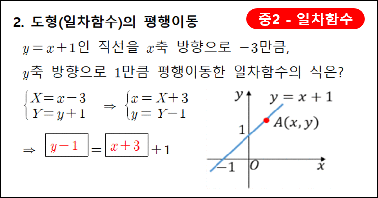 | 중2, 3 | Ⅳ. 일차함수 | 함수의 평행이동 심화 |